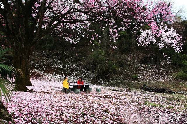每年清明前后,数千株高大的辛夷花树竞相怒放,“辛夷花雨”是药王谷最壮观的景致之一:漫山花开,花枝蔽空、花瓣覆地,颜色由白到粉、由粉到紫,由紫到红,依山成势,形成壮观的高山花海奇观。